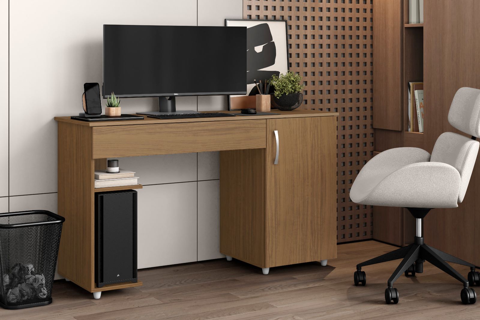 Escrivaninha 1P1N, Côr Atacama, da Aramoveis, Medidas:Alt: 0,785m Larg: 1,36m Prof 0,445m Peso 32Kg - 1 Volume - Estrutura 100% MDP 12mm e 15mm, 1 Porta de Bater com Dobradiças Metálicas, 2 Nichos Internos Divididos por 1 Prateira e 1 Nicho Externo para CPUs, Puxado Plástico Cromado e Pés Plásticos de PVC. Acabamento em Pintura UV Alto Brilho.