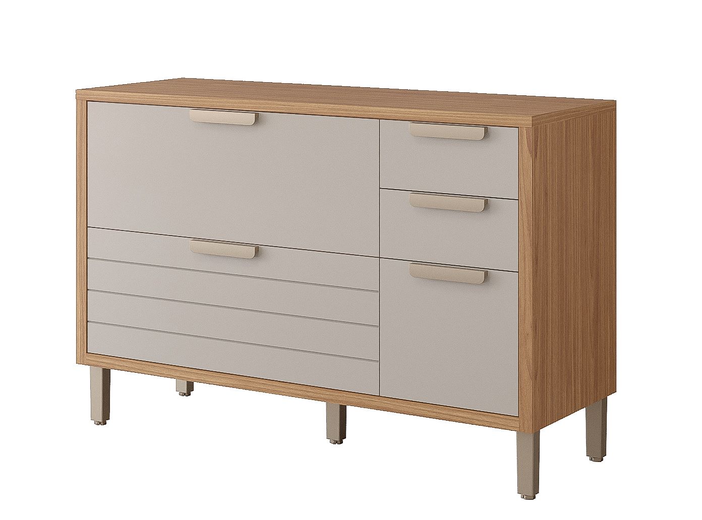 Balcão Eloise 120 1 Porta Basculate 4 Gavetas, Côr Freijô/Off White, da MGM Móveis, Medidas: Alt 0,865m Larg 1,20m Prof 0,52m Peso 84Kg - 1 Volume - Produzido 100% MDF 12mm e 15mm, Fundo em HDF 3mm. 1 Porta Basculante com Pistão a Gás e Dobradiças Slow Motion, 4 Gavetas com Corrediças Telescópicas, sendo uma com Detralhes Frisados, Puxadores ABS, Pés Plásticos Reguláveis de PVC e Acabamento em Pintura UV Semi-Brilho. OBSERVAÇÃO: BALCÃO PREPARADO PARA RECEBER PIA DE AÇO INOX. - FAÇA O COMBO 2 PEÇAS COMPRANDO O AÉREO ELOISE 1P3N OU O AÉREO ELOISE 120 2PB COM VIDRO REFLECTA.