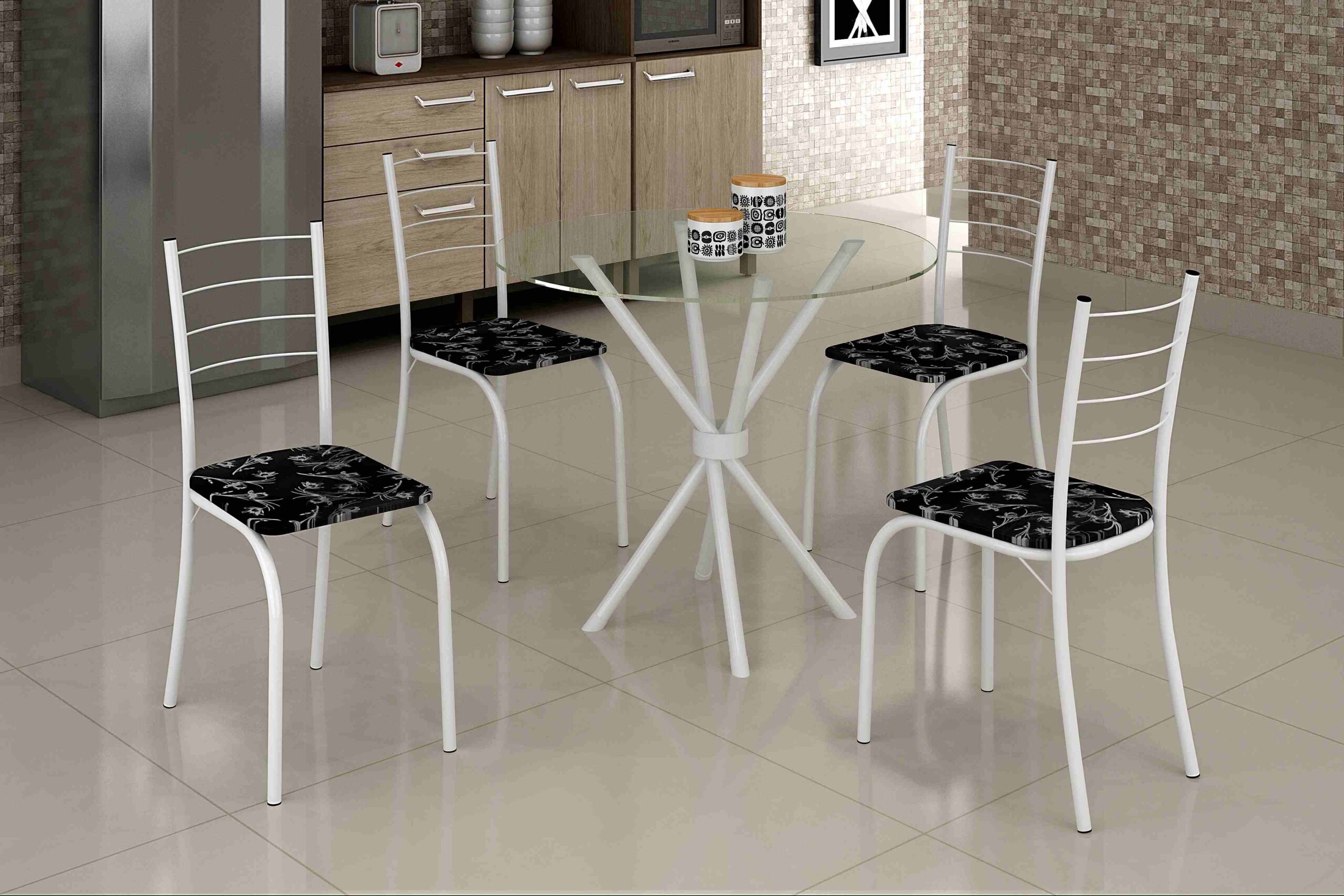 Mesa Rio Tampo de Vidro Redondo, Côr Branco, da Móveis Teixeira, Medidas Base: Alt 0,80m Larg 0,75m Prof 0,75m Tubo 1 1/4", 4 Cadeiras Alt 0,85m Tubo 7/8", com Assentos Forrados Ratan Preto, Base e Caderiras 100% Aço Carbono, Pintura Eletrotática em Pó com Resina Epoxi de Poliéster.