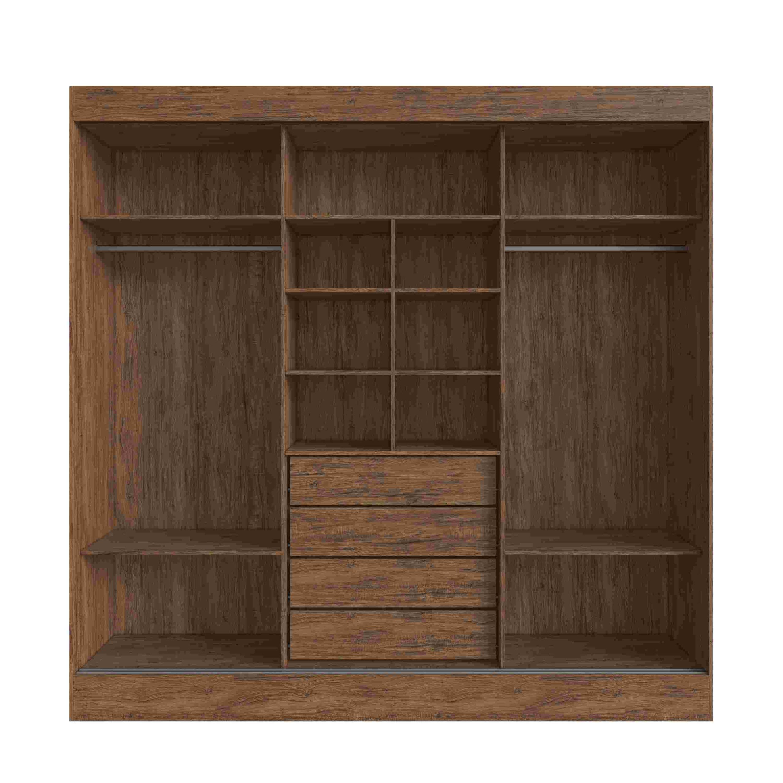 Roupeiro Michigan, Visualização Interna, da Doripel Móveis, Medidas: Alt 2,17m Larg 2,30m Prof 0,53m Peso 156Kg - 4 Volumes - Estrutura 100% MDF. 3 Portas Deslizantes com Roldanas Metálicas com Freios, sobre Trilho de Alumínio e Puxadores de Perfil de Alumínio, sendo uma com Espelho Alt 0,745m x 0,65m. Colméia Interior com 4 Gavetas com Corrediças Metálicas Telescópicas, 2 Nichos com Cabideiros de Alumínio, 6 Nichos Centrais para Roupas e Objetos Pessoais, 2 Nichos Inferiores para Sapatos e Bolsas e 3 Nichos Superiores Horizontais para Roupas de Cama, Malas e Demais Objetos. Acabamento em Pintura UV.
