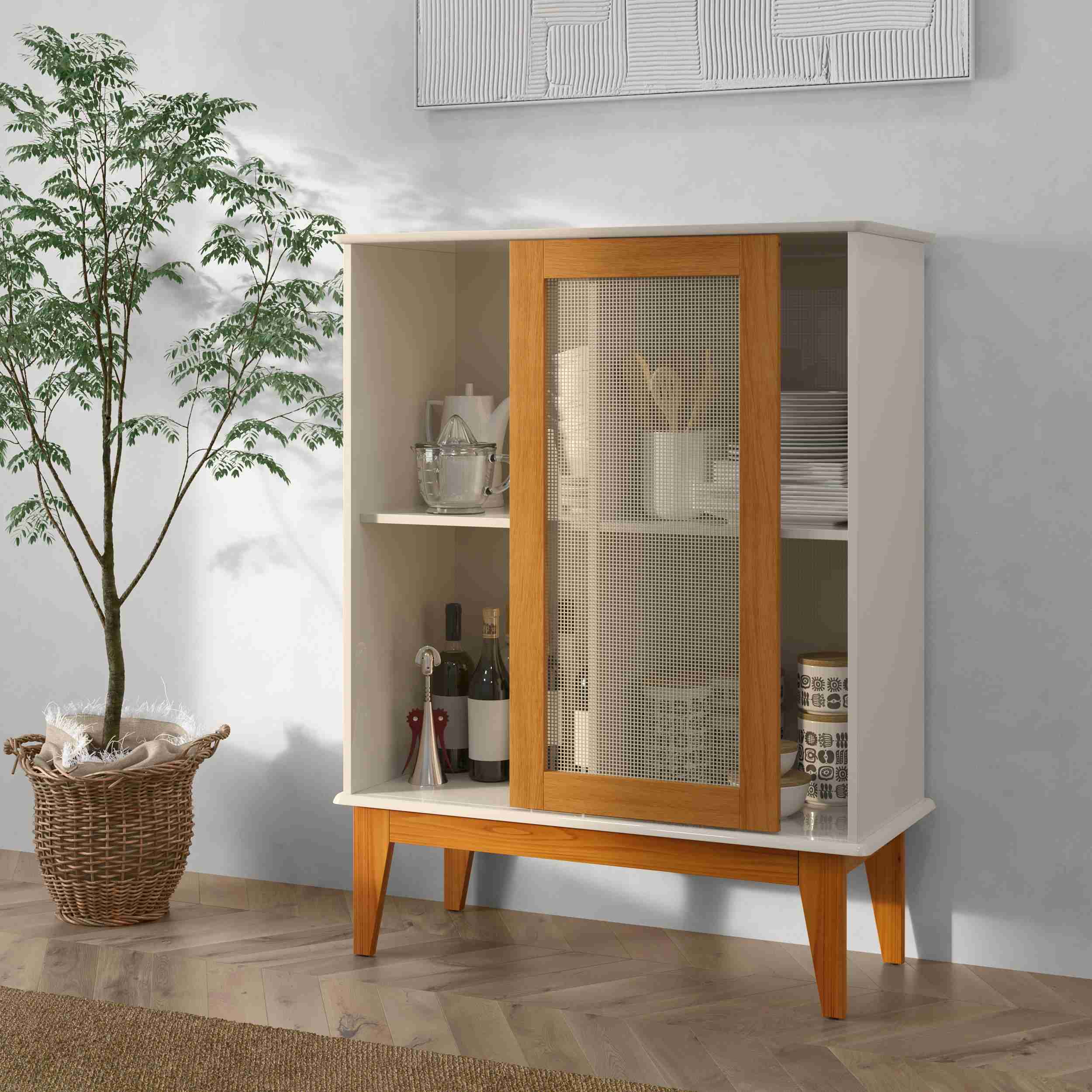 Armário Denver, Côr Off White/Nature, da Tebarrot Brasil, Medidas: Alt 1,185m Larg 0,91m Prof 0,388m Peso 25Kg, - 1 Volume, Estrutura MDF/MDP, Tampo e Fundo com Bordas Chanfradas, 1 Porta de Correr com Detalhe Centro em Fibra Sintética, 1 Divisória Central e 1 Prateleira Central Internas, que fazem 4 Nichos para Louças e Utensílios Domésticos, Pès de Madeira Maciça de Pinus.