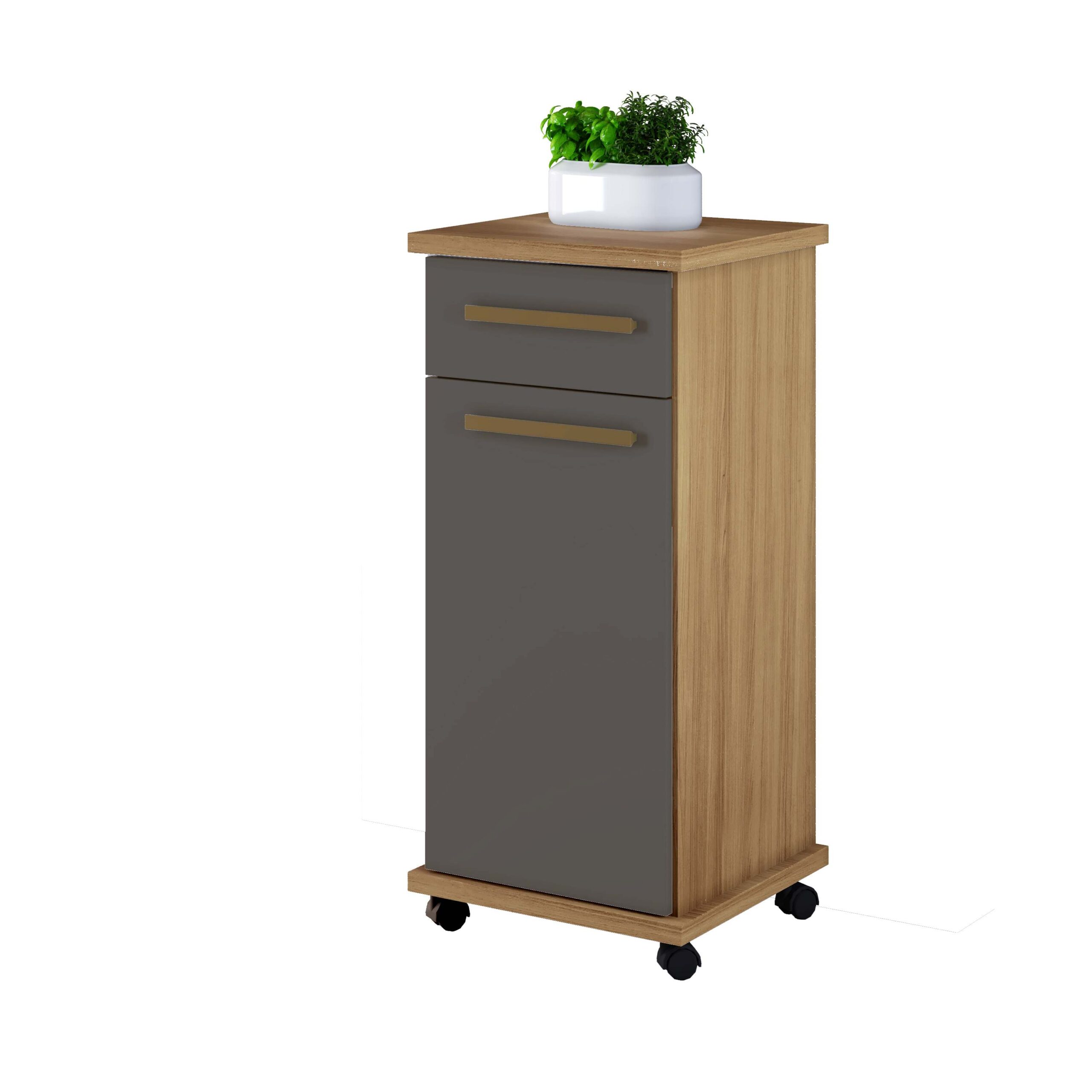 Balcao Palmas, Côr Cinamomo/Grafite, da Arte Moveis, Medidas: Alt 0,88m Larg 0,39m Prof 0,39m Peso 16,5Kg - 1 Volume - Estrutura em 100% MDP 15mm, com Base e Tampo em MDF 25mm, 1 Porta de Bater com Dobradiça Metálica, 1 Gaveta com Corrediças Telescópica, Puxadores de MDF, 1 Prateleira Interna e Rodízios Plásticos.