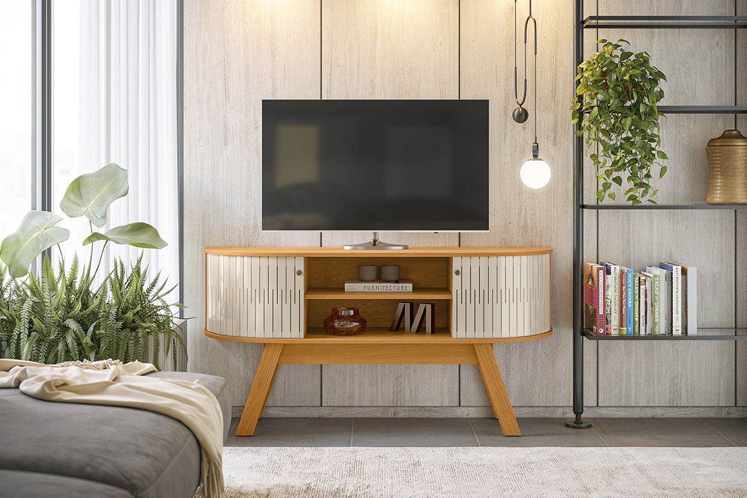 Bancada Atlanta, Côr Cinamomo/Off White, da Madetec, Medidas: Alt 0,68m Larg 1,36m Prof 0,355m, Peso 17,80Kg - 1 Volume - Estrutura 100% MDP 15 E 25mm, Tampo e Base com Laterais Curvas, 2 Portas Delizantes Flexíveis de MDF que Acompanham a Curvatura das Laterais, Trilhos Plásticos, 2 Nichos Centraispara Eletroeletrônicos ou Objetos Decorativos Divididos por uma Prateleira e com Passa Fio, Puxadores de Poliestireno Cromados, Pés Palito, Acabamento em Pintura UV Brilho - Brilho. Suporte para até 29Kg. Ideal para TVs até 55 Polegadas.