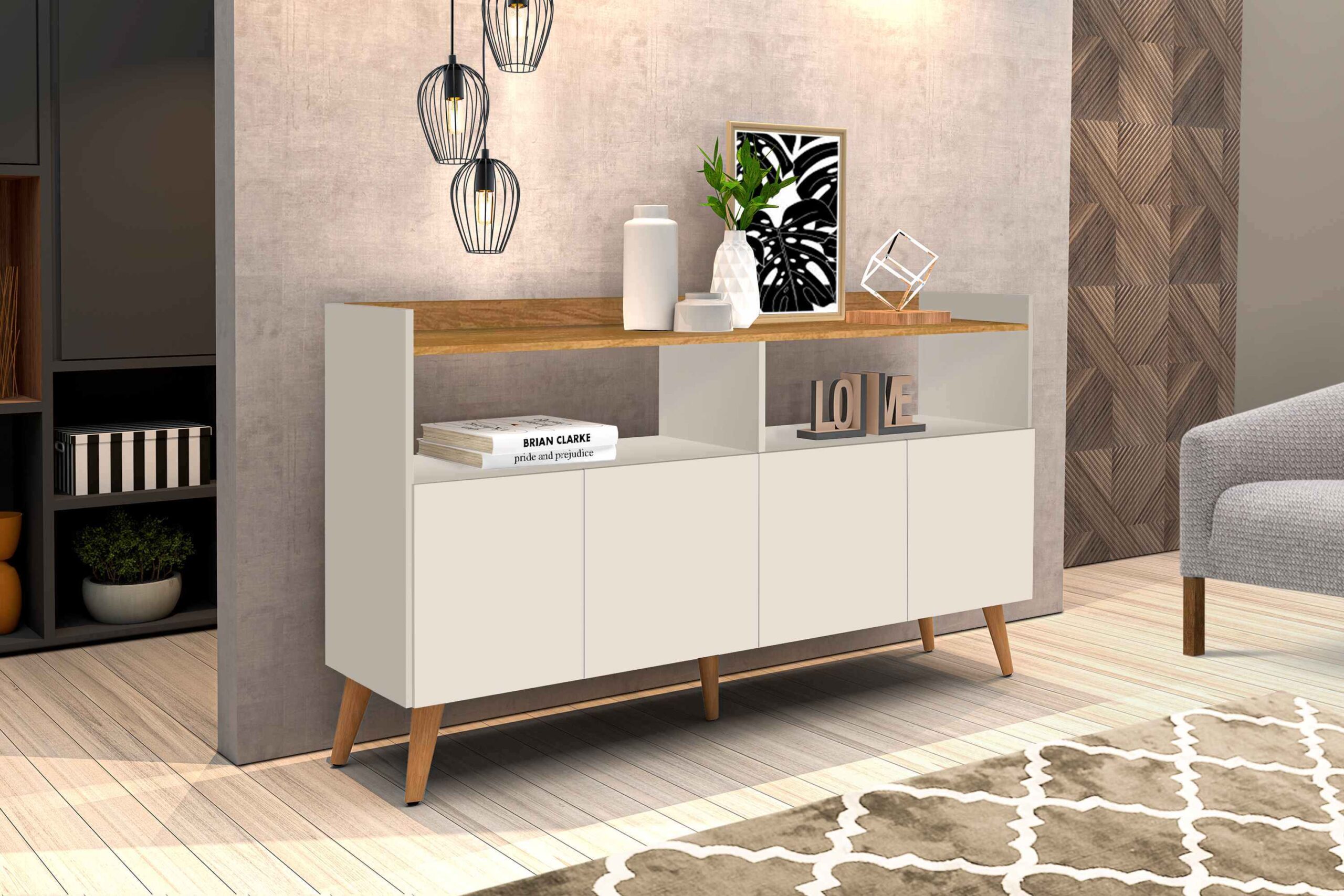 Buffet Master 4 Portas, Côr Off White, da J&A Movéis, Medidas: Alt 0,80m Larg 1,345m Prof 0,33m Peso 24Kg - 1 Volume - Estrutura 100% MDP 12mm e 15mm, 4 Portas de Bater com Dobradiças Metálicas, 2 Nichos com Amplo Espaço Interno para Louças e Utensílios Domésticos, Amplo Nicho Externo Horizontal para Objetos Decorativos ou Louças. Tampo Superior Amplo para Bebidas e Demais Objetos, Pés Retrô de Madeira Maciça. Suporte para até 30Kg. Acabamento em Pintura UV Semi-Brilho.