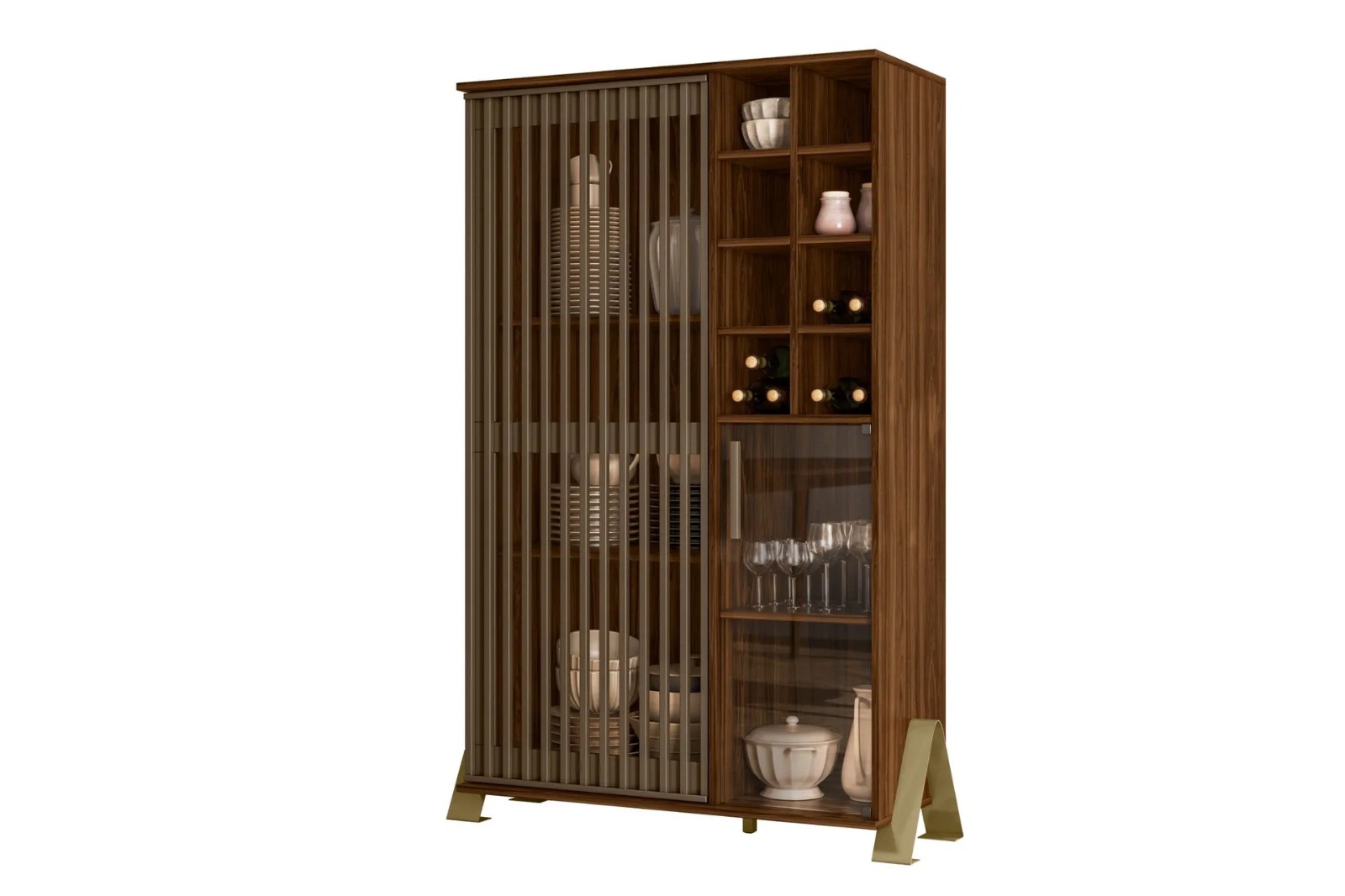 Cristaleira Metallic, Côr Palissandro, da Mobler, Medidas: Alt 1,46m Larg 0,98m Prof 0,38m - Estrutura 100% MDP, 1 Porta de Bater Ripada e Vazada de MDF com Pintura Metalizada Bronze, 1 Porta de Bater de Vidro com Puxador de MDF, ambas com Dobradiças Metálicas, Adega Lateral com 8 Nichos para até 24 Garrafas e/ou Louças, 3 Prateleiras Internas e Pés de Metal Maciço Curvo com Pintura Epoxi na Côr Dourada.