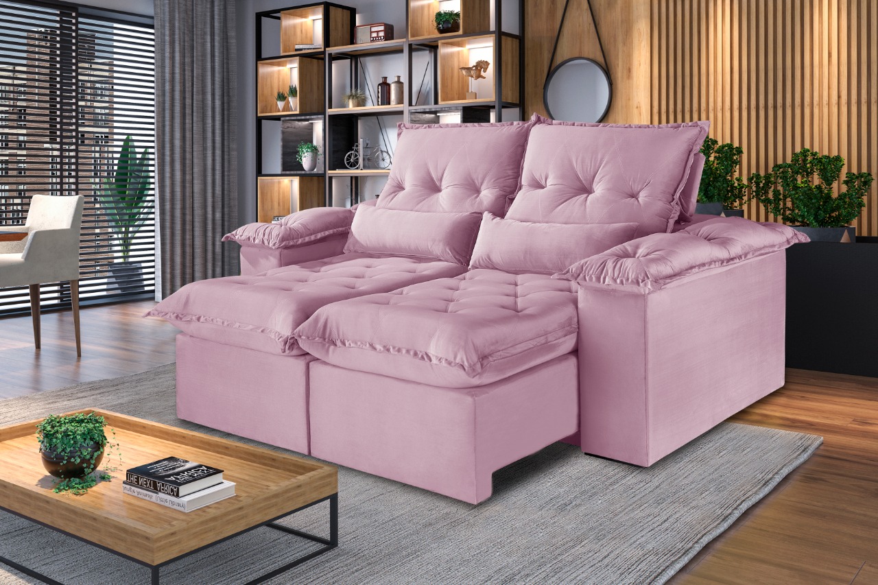 Estofado Retrátil Reclinável Ouro Preto, Tecido: Veludo Jolie, Côr: Rose, da Idealle, Medidas: 2 Módulos: Alt 1,20 Larg 0,90m Prof Fech 1,20m Prof Aberto 1,80m, Braço 0,25m - Estrutura de Madeira, Blindagem nos Rodapés, Caixa Traseira e Parte Superior, Assento com Percintas Elásticas e Molas, Estofamento em Espuma Selada de 18cm Alt, Encosto, Pillow dos Braços e Rineiras 100% Fibra Siliconada.