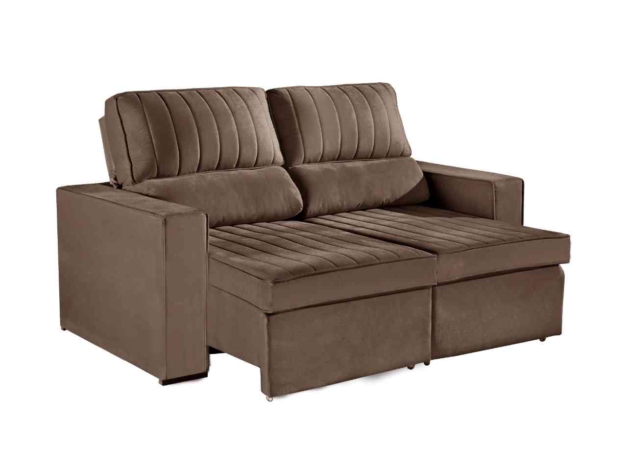 Estofado Retrátil Reclinável New Napoli, da Idealle, em Veludo Inca, Côr Marrom 17, Medidas: Alt 1,04m Larg 1,85m Prof Fechado 1,00m Prof Aberto 1,45m, Estrutura em Madeira de Eucalipto, Chapa OSB, Encosto Removível com Percintas, Fibras Siliconadas e Flocos, Assento com Percintas Elásticas, Espuma D28. Pillow Top 12cm e Mola Espiral, Braços com Espuma D18 e Pés de Madeira