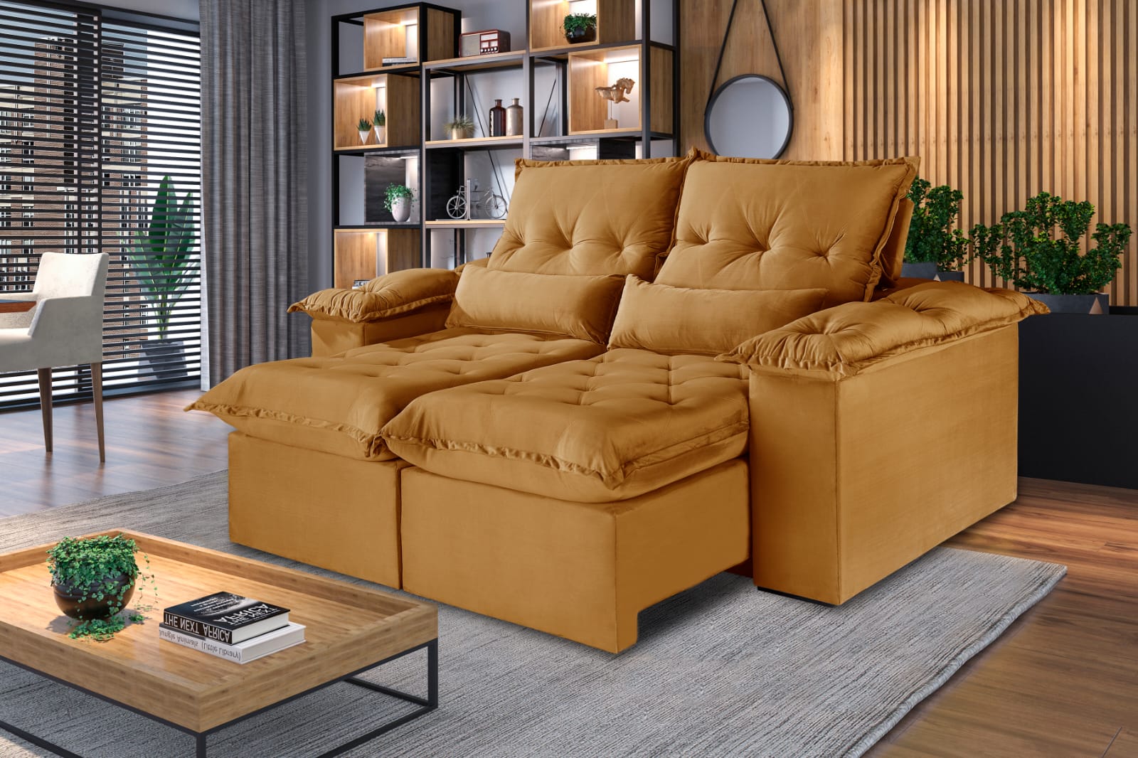 Estofado Retrátil Reclinável Ouro Preto, Tecido: Veludo Jolie, Côr: Terracota, da Idealle, Medidas: 2 Módulos: Alt 1,20 Larg 1,20m Prof Fech 1,20m Prof Aberto 1,80m, Braço 0,25m - Estrutura de Madeira, Blindagem nos Rodapés, Caixa Traseira e Parte Superior, Assento com Percintas Elásticas e Molas, Estofamento em Espuma Selada de 18cm Alt, Encosto, Pillow dos Braços e Rineiras 100% Fibra Siliconada