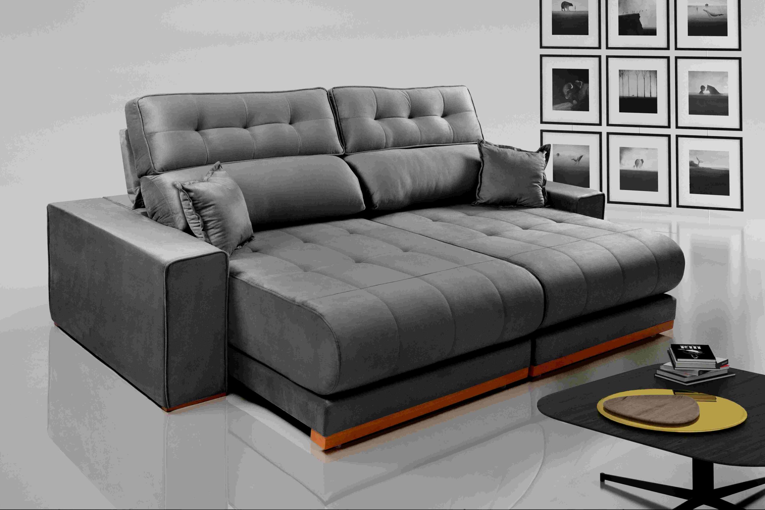 Estofado Retrátil Reclinável Dakar 230 Molas Ensacadas, Tecido: Veludo, Côr Grafite 814, da Evidence Estofados, Medidas: 2 Módulos: Alt 1,15m Larg 0,90m + 0,25m de Braço Prof Fechado 1,25m Prof Aberto 1,85m - Estrutura de Madeira Maciça de Eucalipto, Assento com Pillow 32cm, Estofafamento em Espuma Certificada D28, Manta Siliconada e Molas Bonnel Ensacadas Individualmente, Encosto Reclinável em 7 Estágios, com Sistema de Catracas Blindadas de Encaixe e Almofadas Estofadas com Fibras 100% Silicone. Sistema Retrátil em Aço Carbono, Detalhe no Rodapé em Madeira de Eucalipto com Acabamento em Veniz Acetinado. Pés de Madeia e Roldanas de PVC. Obs.: Acompanha 2 Almofadas Decorativas.