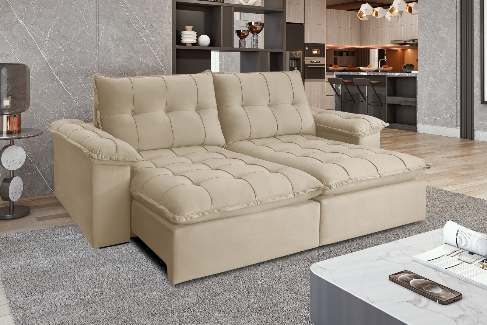 Estofado Retrátil & Reclinável Iriri, Tecido: Veludo Inca, Côr Capuccino 15, da Idealle, Medidas: 2 Módulos: Alt 1,14 Larg 0,90m Prof Fech 1,20m Prof Aberto 1,80m, Braço 0,25m - Estrutura da Caixaria em Madeira Maciça de Eucalipto toda Blindada , Estofado Duplo Molejo (Assento/Caixa), Assentos com Molas Pocket e Pillow 20cm e Espuma Selada D23, Encosto com Almofadas com Enchimento 100% de Fibras Siliconadas (Cortex), Pillow nos Braços e Sistema de Catraca Blindada de Encaixe.