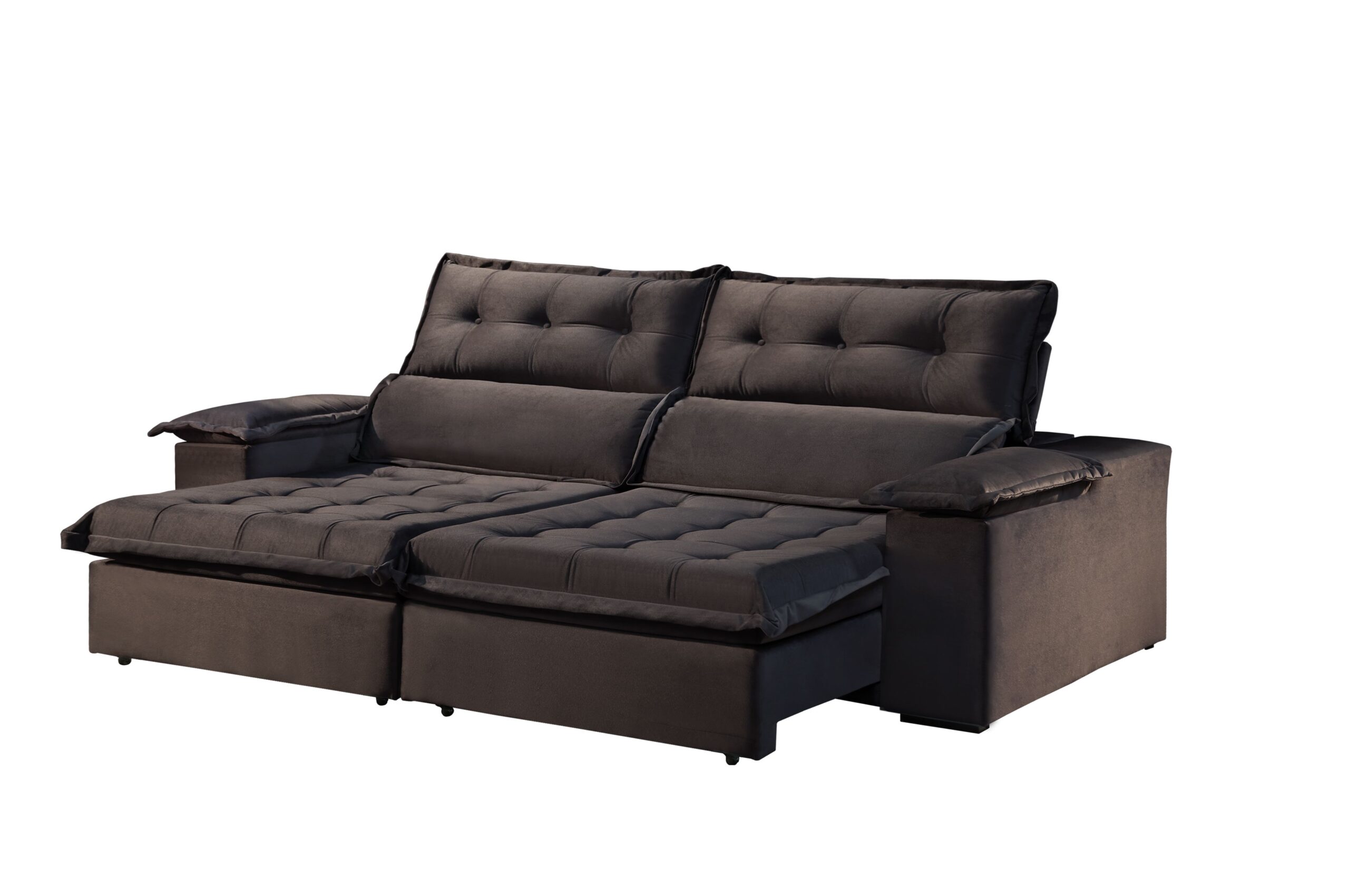 Estofado Retrátil Reclinável São Gonçalo 230, Tecido: Veludo Suede, Côr Marrom - 321 da Estof Teixeira, Medidas: 2 Módulos: Alt 1,12m Larg 1,15m Prof Fechado 1,20m Prof Aberto 1,80m - Braço 0,25m, Estrutura em Madeira Maciça de Eucalipto, Assentos com Molas Bonel, Percintas Italianas e Espuma Soft D28 de 20cm, Encosto Reclinável com Almofadas de Fibra de Silicone e Piillow de14cm de Fibras de Silicone, Pés de Madeira e Rodízios de Silicone.