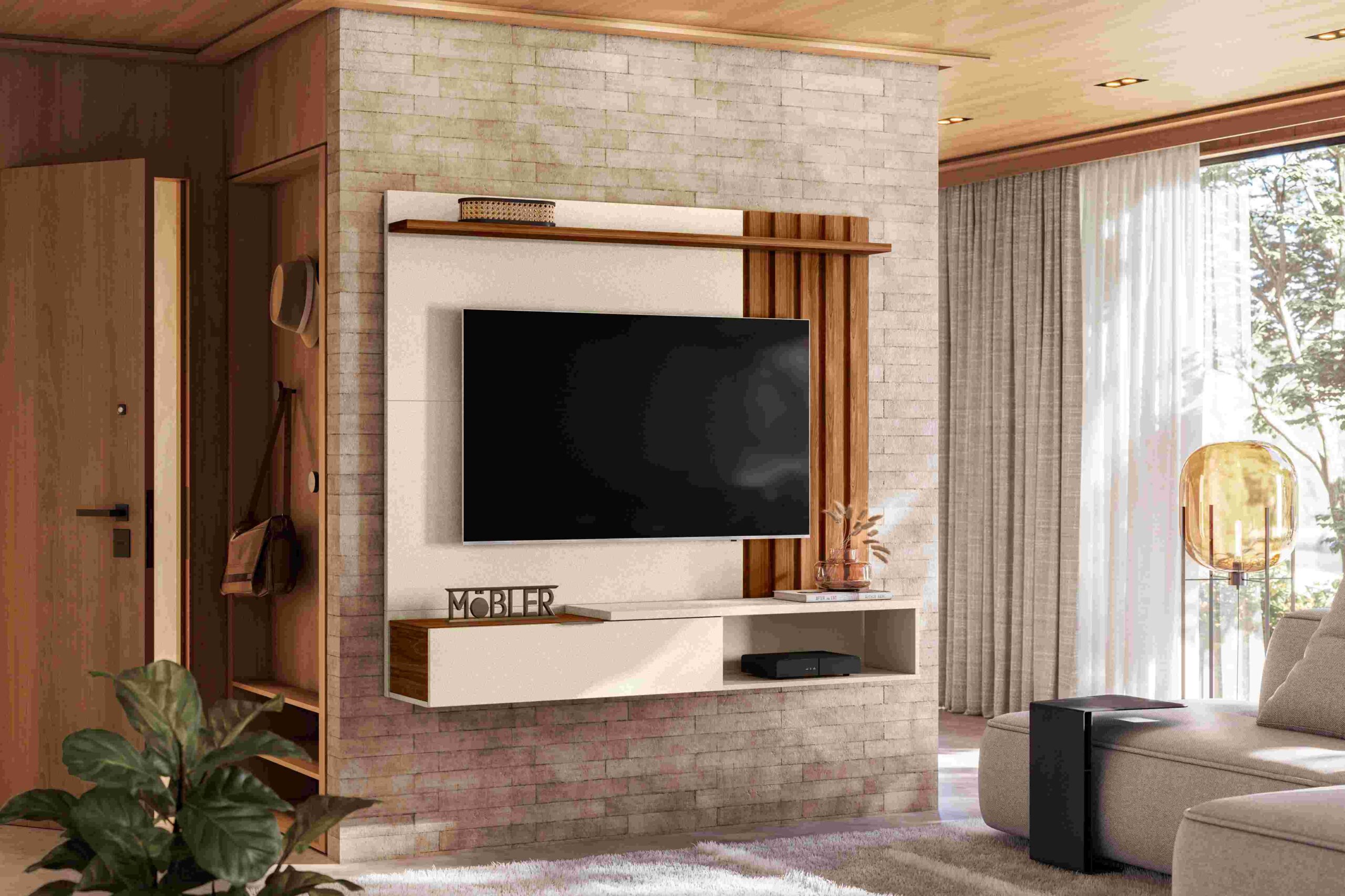 Home Suspenso Vegas 1.6, Côr Pérola Metalizado/Cinamomo Mel, da Mobler, Medidas: Alt 1,38m Larg 1,60m Prof 0,312m Peso 48,2Kg - 2 Volumes - Estrutura Predominantemente MDP 15mm, 1 Porta Basculante com Dobradiças Metálicas, Pistão a Gás e Puxador de Alumínio, Nichos para Eletroeletrônicos ou Objetos Decorativos, Tampos Sobrepostos e Prateleira Superior de MDP 25mm, Painel Central com Lateral em Detalhes Ripados Autênticos, Passa Fios, Suporte para até 30Kg e Ideal para TVs até 65 Polegadas. Acabamento em Pintura UV Brilho/Semi Brilho.