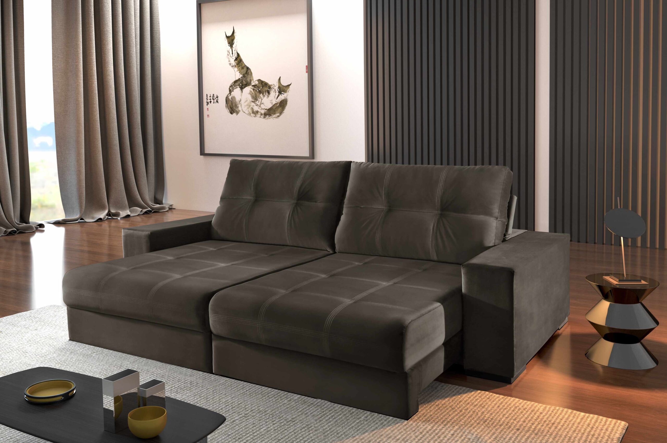 Sofa Retrátil Reclinável Luisa, em Veludo Suede, Côr Marrom/2231B, da Luxury Estofados, Medidas: Alt 1,05m Larg 2,50m Prof Aberto 1,80m Prof Fechado 1,30m, Braço 0,25m cada, Estrutura em Eucalipto, revestido com 10cm de Espuma D26 no Assento e Encosto Fixo com 70cm de Alt., Molas Ensacadas no assento, braços em Espumna D23.