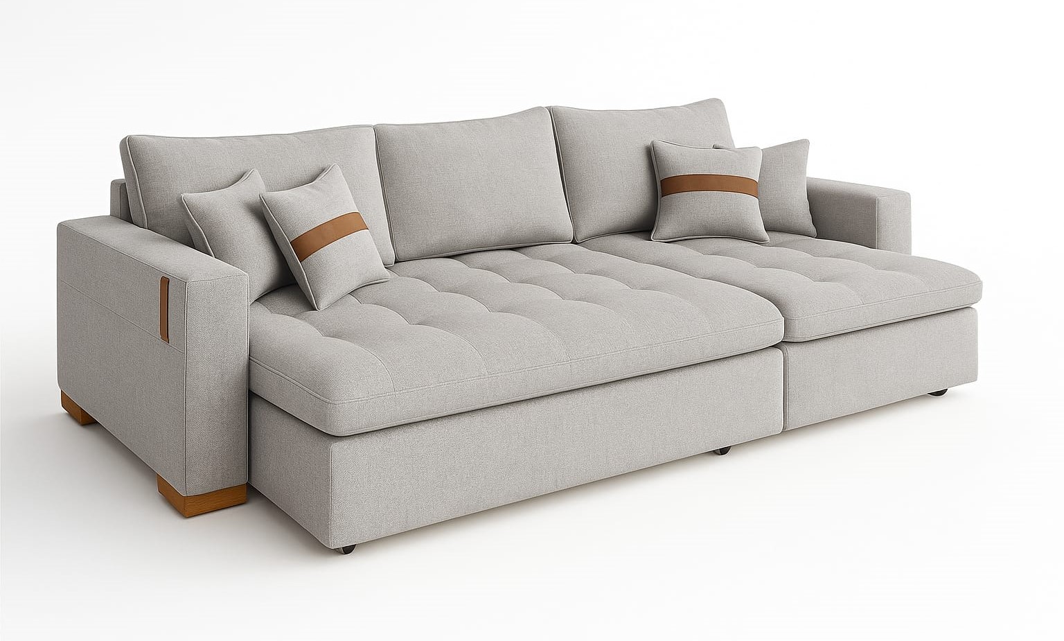 Sofá Sem Caixa Retrátil Lisboa 240, Tecido: Linho, Côr: Cinza Claro 20, da We Art Decor. Medidas: Alt 1,00m Larg Total 2,40m (2 Módulos com Assento 1,00m + Braço 0,20m) Profundidade Fechado 1,20m Profuncidade Aberto 1,50m. Estrutura 100% Madeira Maciça de Eucalipto Tratado. Assento Estofado com Espuma de Poliuretarno D28 Plus, Manta Acrílica 100% Poliéster Siliconada, Percintas Elásticas Italianas e 4 Molas Bonnel por Assento. Encosto Composto por 2 Almofodas Soltas com Enchimento com Fibras Silicondas de Poliéster e 4 Alomofadas Decorativas com o mesmo Enbchimento. Pés de Madeira com Acabamento em Verniz Acetinado, Rodízios de Silicone. Revestimento em Tecido de Linho Sintético 100% Poliéster e Detalhes em Tiras de Couro Sintético. Suporte para até 120Kg por Pessoa.